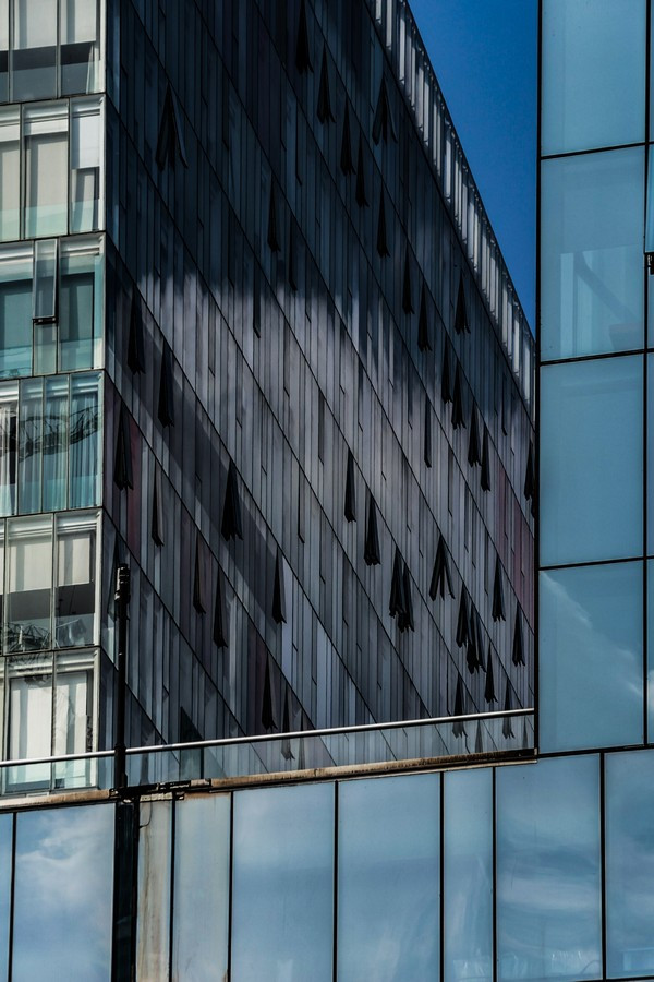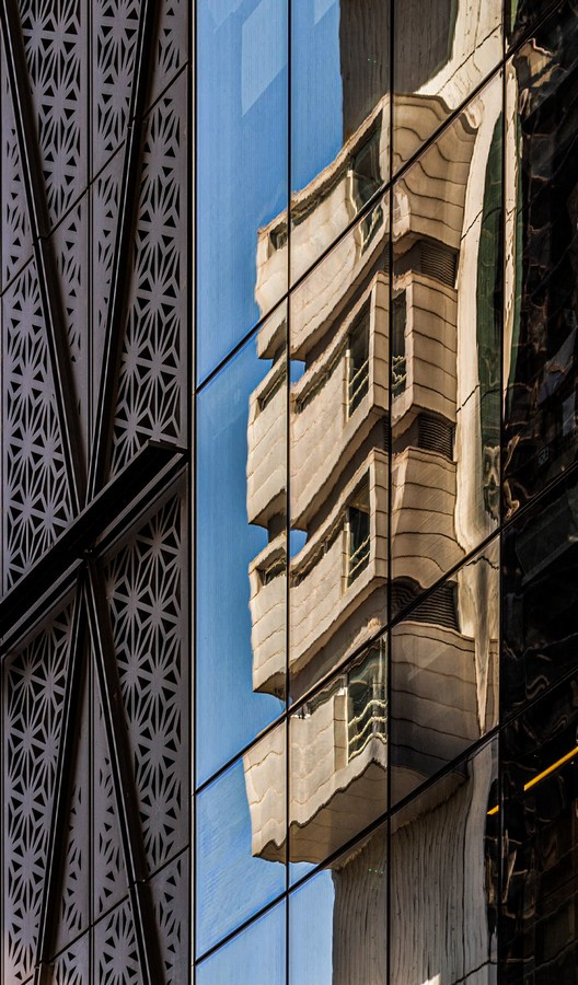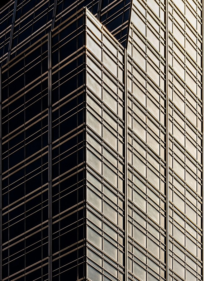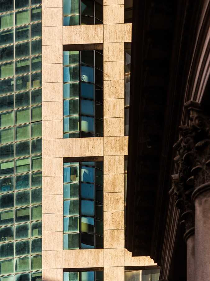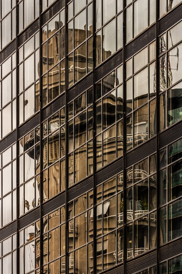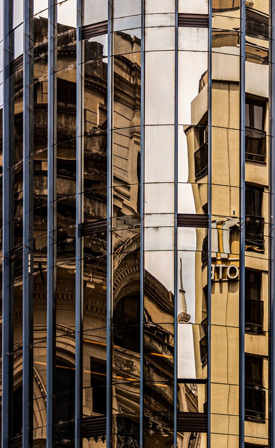 Las fotografías surgen de caminar la ciudad con la mirada puesta en los bordes: el recorte cerrado, la vertical exacerbada, el momento preciso en que la luz del atardecer vuelve dorado un volumen o enfría los vidrios hasta volverlos espejo del entorno. En muchos encuadres desaparece el horizonte y también la escala humana; lo que queda es un campo de fuerzas: tramas que se ordenan y se desordenan, reflejos que mezclan edificios de épocas distintas, sombras que hacen vibrar la superficie. La cámara no documenta tanto un edificio concreto como la sensación de estar rodeado por una masa arquitectónica que nos excede.